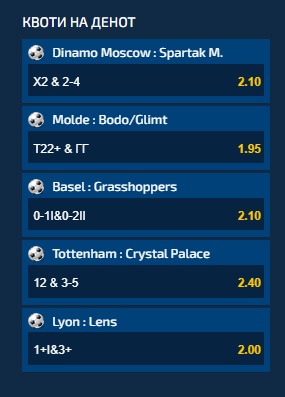 Динамо Москва се среќава со Спартак Москва и ако гостите не загубат, а на мечот бидат постигнати од два до четири гола, квотата на денот е 2.10.