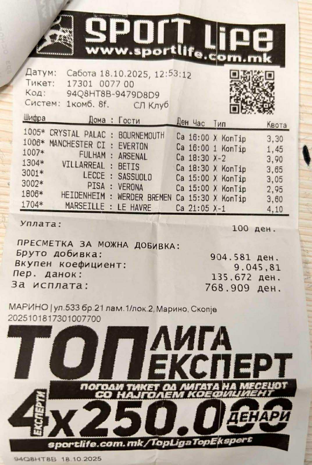 Тикетот е уплатен со само 100 денари, а вкупниот коефициент кој е направен е 9.045, што значи дека бруто добивката изнсува 904.581 денари, додека нето добивката со која си замина експертот од Марино изнесува 768.909 денари, односно околу 12.500 евра.