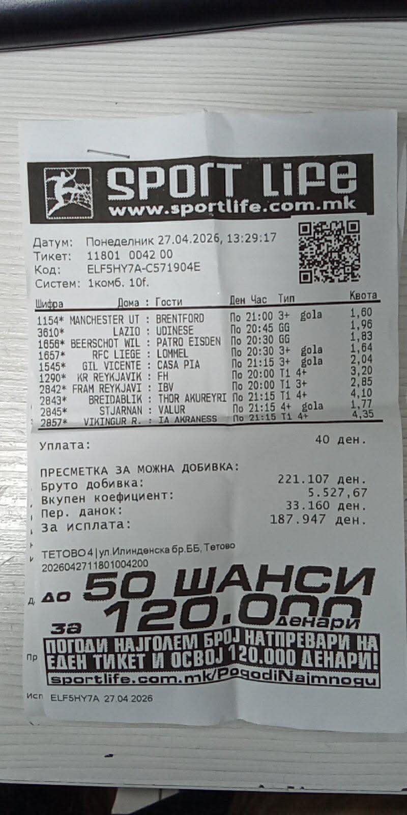 На десетте мечеви, погоден е вкупен коефициент од 5.527, што за многумина е невозможно да се направи таков тикет, а овој дури е и добитен.