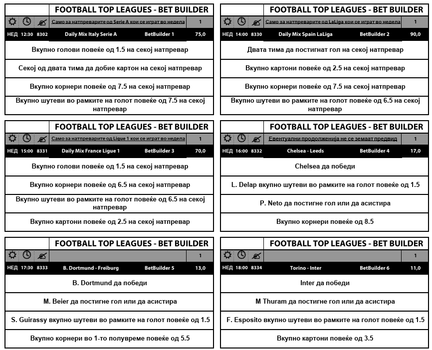 Неделната Бет билдер понуда на Sport Life е составена од 10 билдери и варијанти со квоти кои одат и до 90.0 како што е дневниот микс за денешните мечеви од шпанската Ла Лига. Оваа џиновска квота од 90.0 ќе биде добитна ако на сите четири меча кои се играат денеска секој од осумте тима постигне гол, ако има над 2,5 картони на секој меч, над 7,5 корнери и повеќе од 6,5 шутеви во рамки на гол.