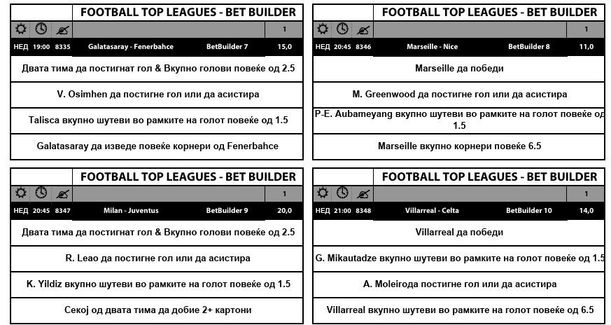 Миксови има и за италијанската и француската лига. Тука е билдерот и за второто полуфинале во ФА купот, како и за уште шест средби. Па, ако верувате во Челзи, Дортмунд, Интер, Марсеј, Виљареал, и дека двата тима ќе даваат гол на дербијата во Истанбул и Милано, уплатете и чекајте огромни добивки.