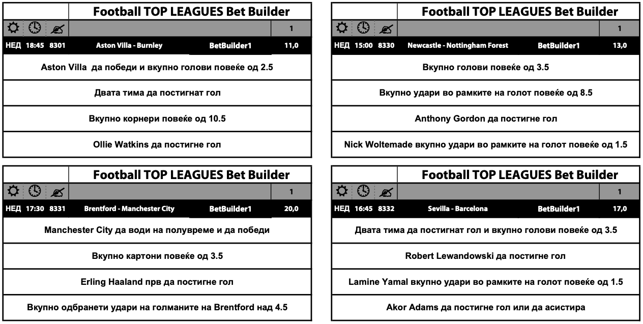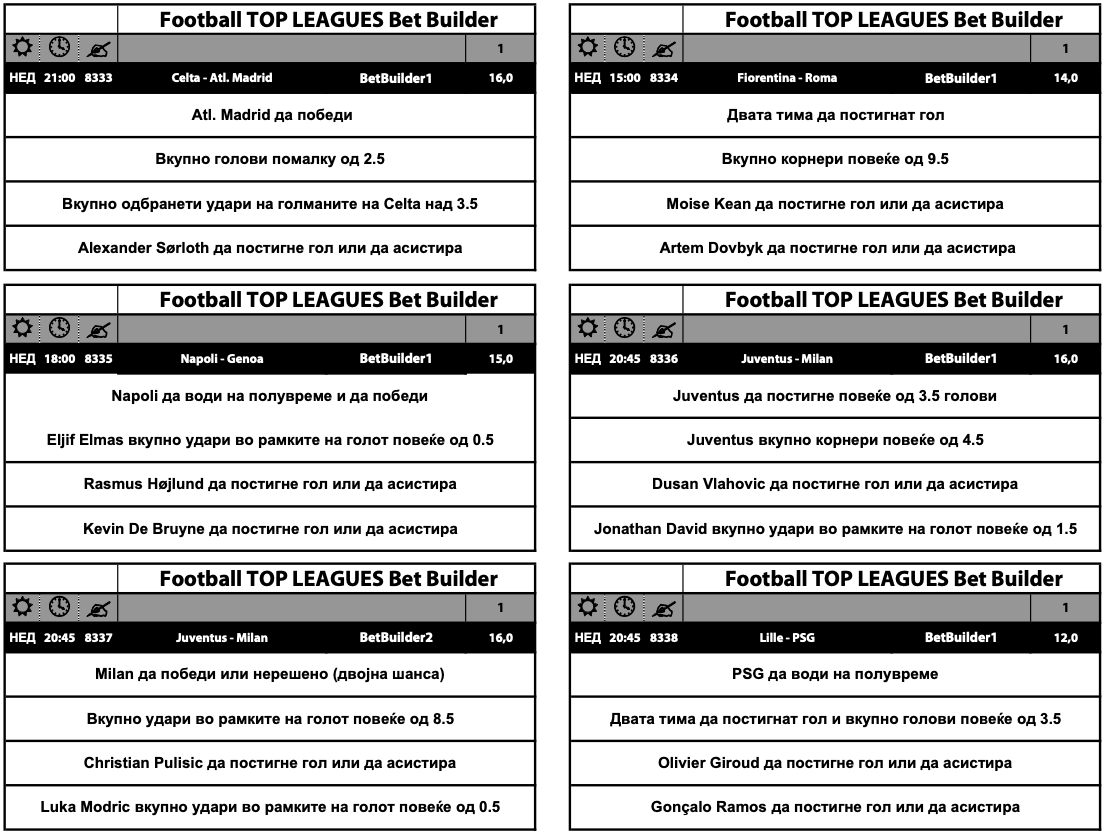 Италијанското дерби помеѓу Јувентус и Милан е единствениот меч за кој има две опции во денешниот Бет билдер, а и за двете има квоти од по 16.00. Квота од 16.00 има и за мечот на Атлетико Мадрид, 15.00 е квотата за Наполи, 14.00 за Фиорентина и Рома, додека ПСЖ има една опција со квота од 12.00.