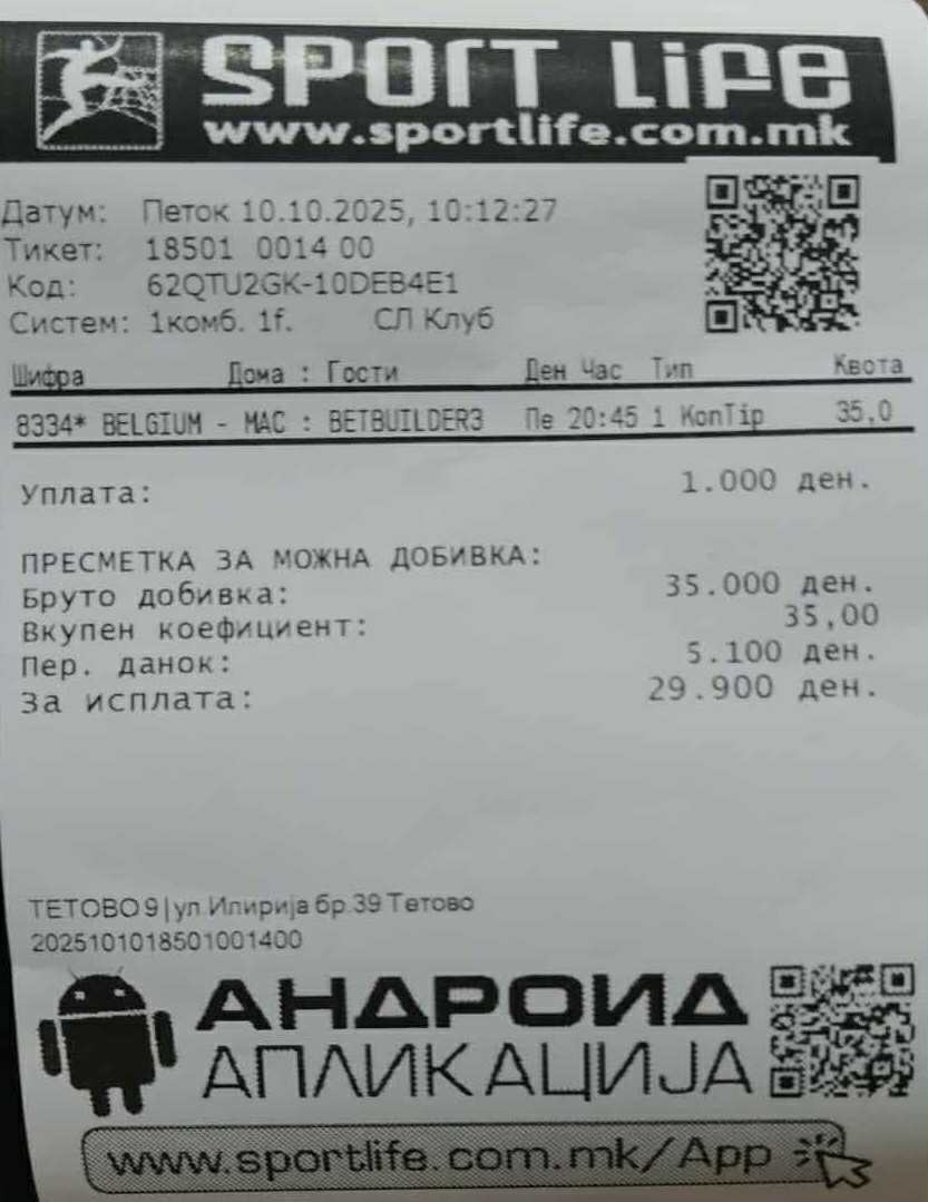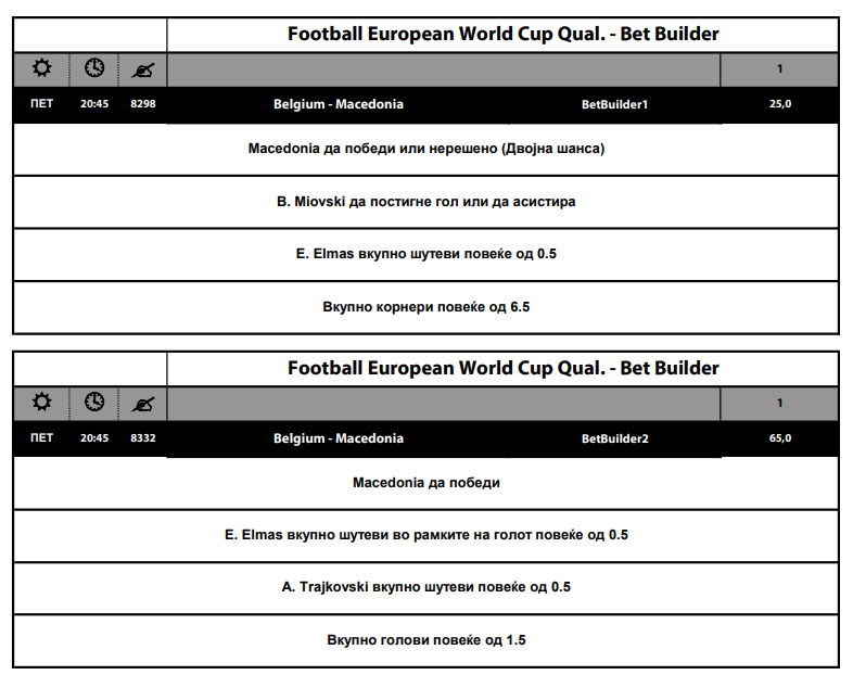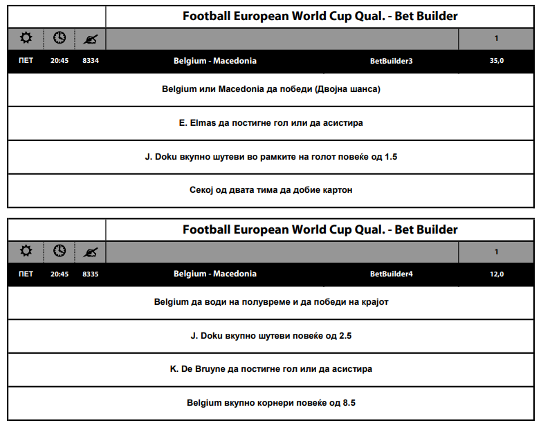 Белгија е голем фаворит за победа, но Македонија не се предава предвреме. За овој многу важен меч, во Sport Life има одлични Бет билдер понуди каде квотите се движат од 12 до 65. Ние нудиме една примамлива понуда која има квота 35, а за да биде добитна потребно е: Белгија или Македонија да победи (двојна шанса), Елиф Елмас да постигне гол или да асистира, Доку да има над 1,5 шутеви во рамките на голот и секој од двата тима да добие картон.
