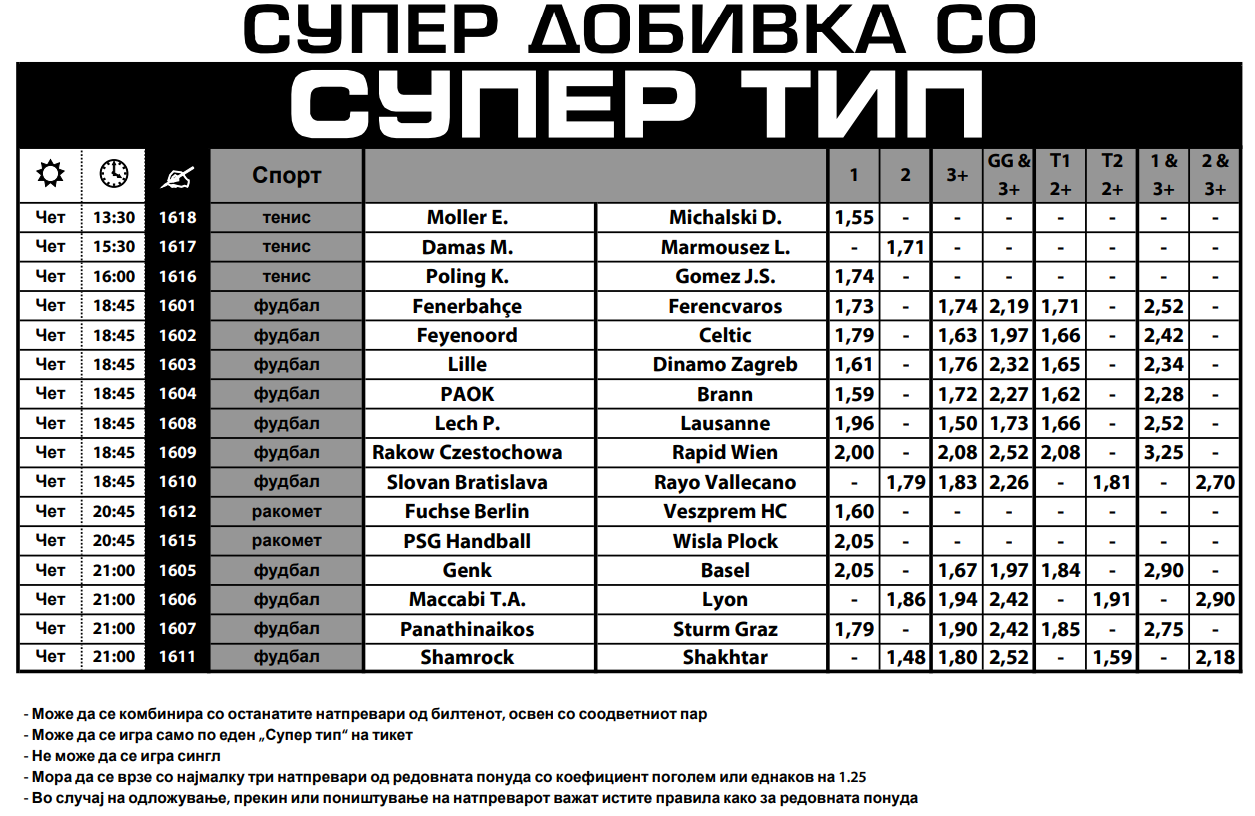 Тенис, ракомет и фудбал има во денешната понуда со зголемени коефициенти во Sport Life. Возбудувањата ќе започнат со три тениски пресметки на кои играчите кои се во улога на фаворити за победи имаат квоти меѓу 1.55 и 1.74.