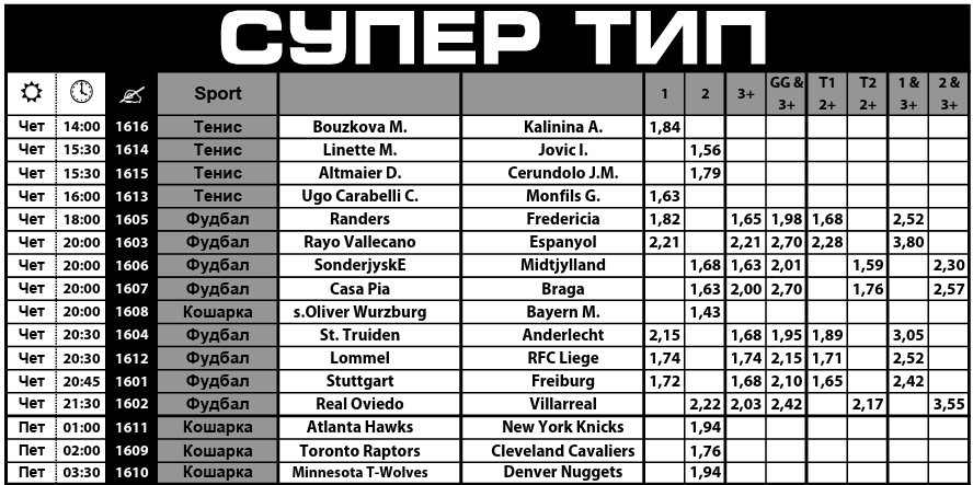 Интересно е дека на сите мечеви од НБА-лигата, фаворити се гостите и набилданите квоти се за победи на гостинските екипи, а тоа важи и за кошаркарскиот меч во Германија, на кој Баерн би требало да го победи Вирцбург. Традиционално, кај фудбалите имате по пет зголемени квоти за секој меч, па може да одберете дали да одиграте на конечен тип или некоја друга игра во која се вклучни и голови.