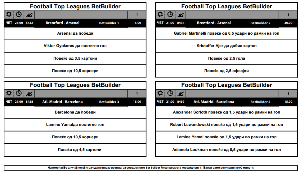 Во шпанскиот куп ќе има спектакл во полуфиналето. Атлетико Мадрид е домаќин на Барселона, а во двете Бет билдерски понуди, квотите се по 15. Една од комбинациите што треба да се погоди за да биде добитна е: Барселона да победи, Ламин Јамал да даде гола, да има над 10,5 корнери и да има над 4,5 картони.