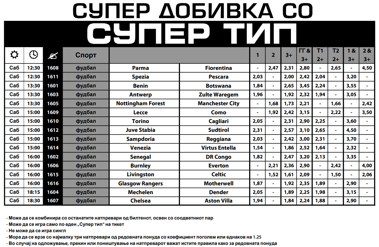 Само на пет меча има зголемени коефициенти за победи на гостинските екипи. Фиорентина да слави на гости кај Парма е со квота од 2.47, а меѓу очекуваните „двојки“ тука се и можни победи на Манчестер сити кај Нотингем форест, Селтик да триумфира на теренот на Ливингстон, како и тоа Евертон да победи кај Барнли.