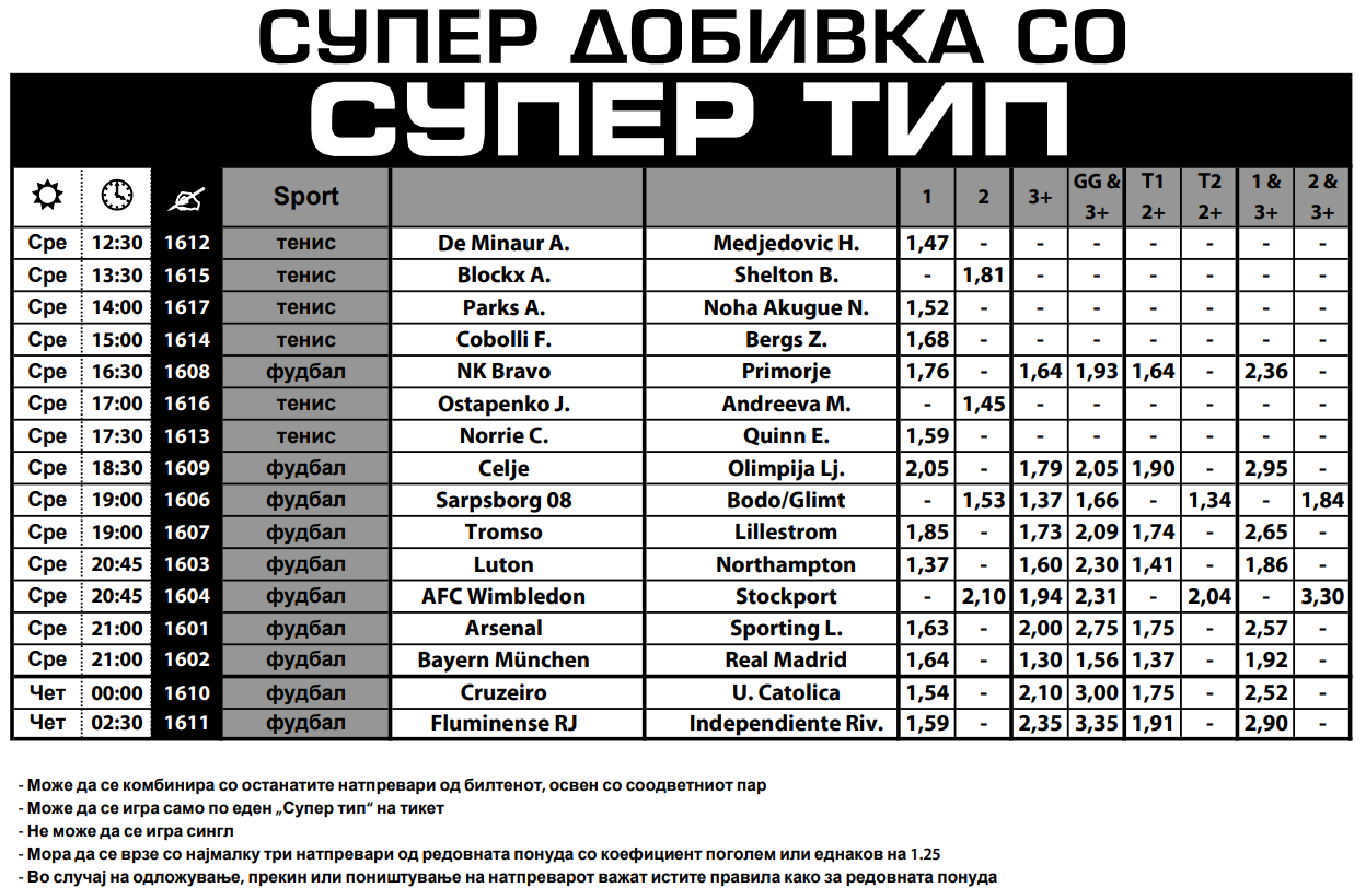 Речиси идентични се коефициентите за триумфи на Арсенал и Баерн Минхен во пресметките против Спортинг Лисабон и Реал Мадрид во дуелите од Лигата на шампионите. Возбудувањата во Супертипот ќе завршат со два полноќни дуела од Копа Либертадорес, каде што зголемени се коефициентите за победи на домаќините Крузеиро и Флуминезе.