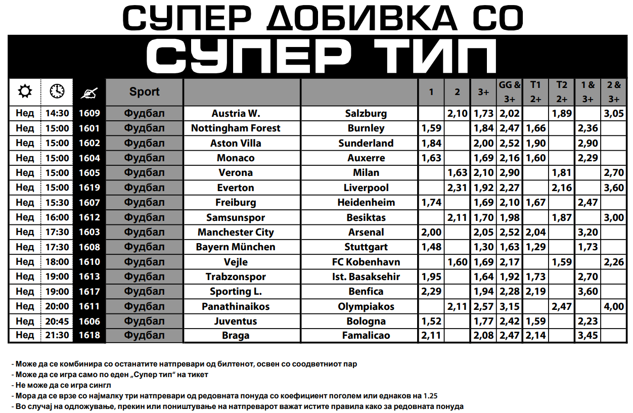 Целосно фудбалски е денешниот Супер тип во Sport Life со мечеви од најатрактивните лиги во Европа. Астон вила има тежок меч на домашен терен против Сандерленд, а за „кец“ квотата е зголемена на 1.84. На дебито во Премиер лигата меѓу Манечстер сити и Арсенал, фаворити се Граѓаните, а зголемениот коефициент за победа на домаќините достигна точно 2.00.
