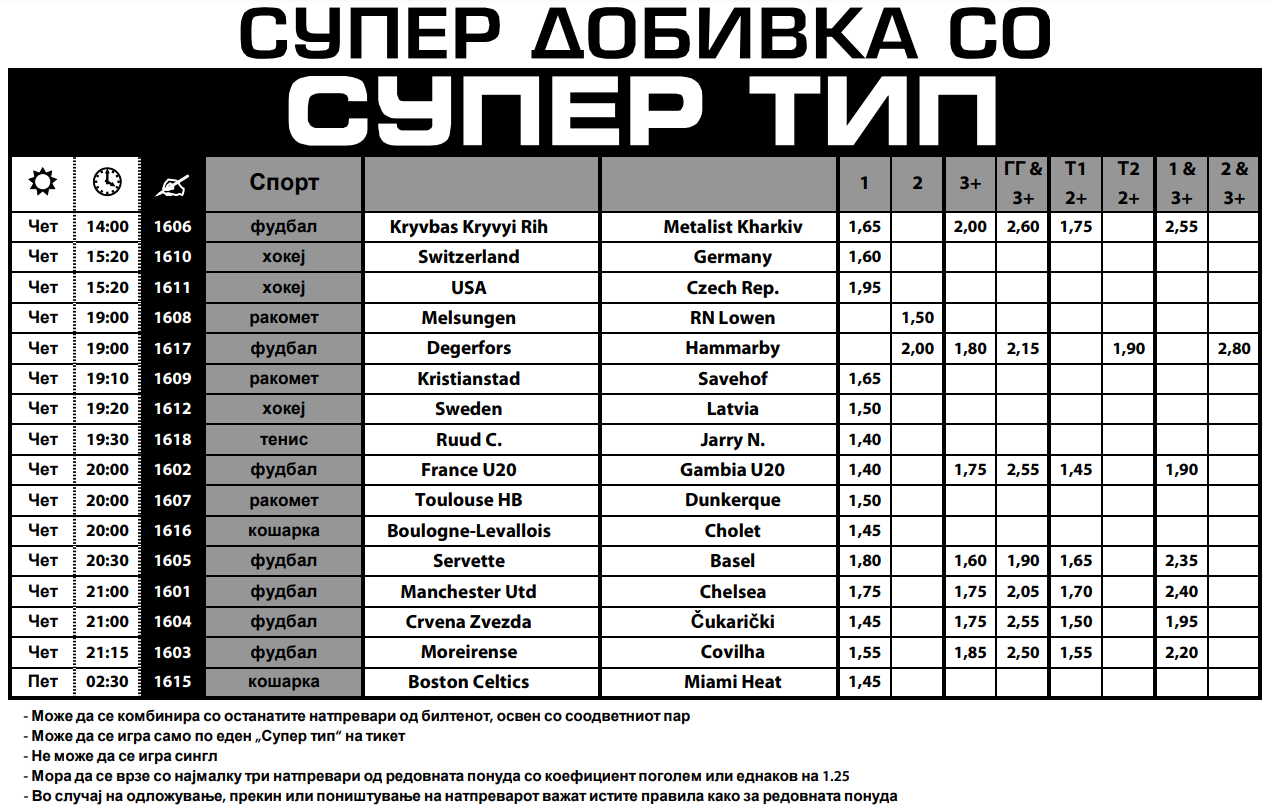 Фудбалската понуда стандардно е најголема, а има повеќе интересни средби. Убава е квотата за победа на Манчестер јунајтед на „Олд Трафорд“ во дербито против Челзи, а Црвена ѕвезда треба да го освои пехарот во Купот на Србија.