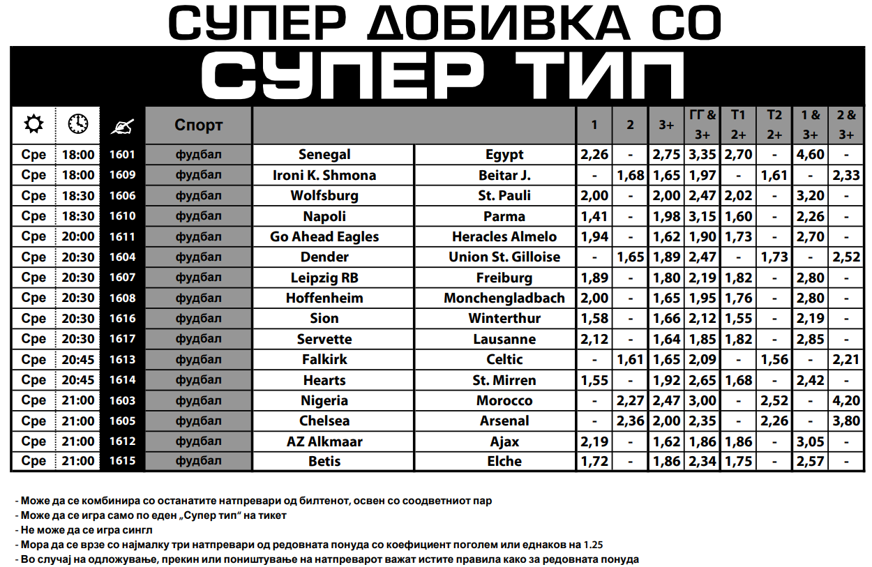 Фудбал, фудбал и само фудбал има во денешната понуда на Супер типот во Sport Life, каде што може да се најдат многу зголемени коефициенти. Интересно е дека сите 16 понудени натпревари се играат во периодот од 18 до 21 часот, а возбудувањата ќе започнат со првото полуфинале на Африканскиот куп на нациите меѓу Сенегал и Египет. Улогата на фаворит тука ја има Сенегал, па „кецот“ е зголемен на 2.26.