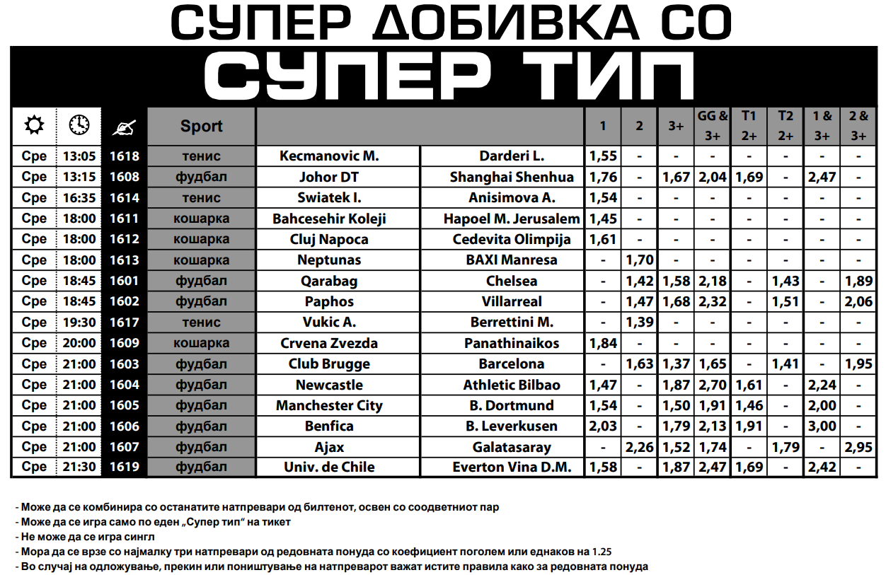 Тенис, кошарка и фудбал има во денешната понуда во Супер типот на Sport Life. Кецмановиќ е фаворит во дуелот против Дердери, додека Беретини треба да слави над Вукиќ. Кај женскиот дел од тенисот, Ига Швјонтек е фаворит за победа над Анисимова.