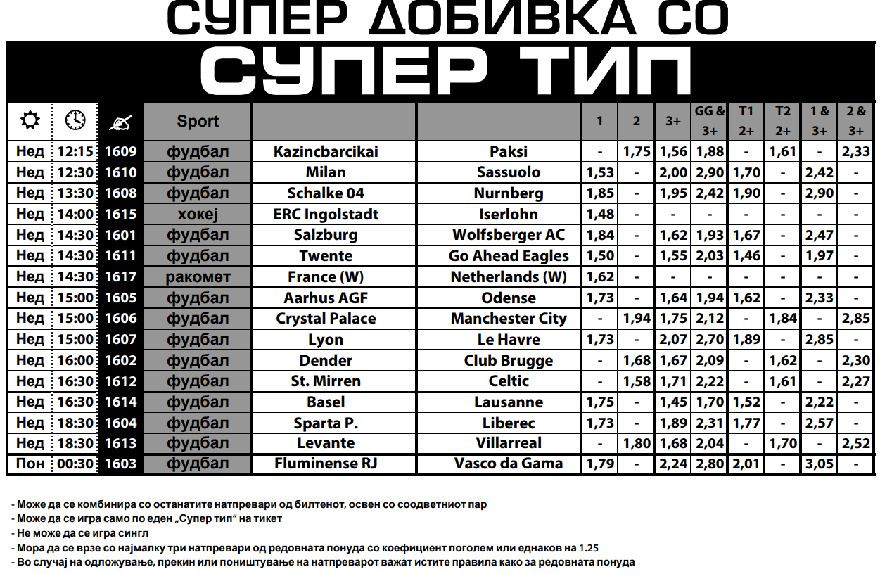 Фудбалските возбудувања во Супер типот почнувата уште на пладне. Пакси е фаворит за победа на гости во унгарското првенство, додека Милан треба да слави над Сасуоло на „Сан Сиро“.