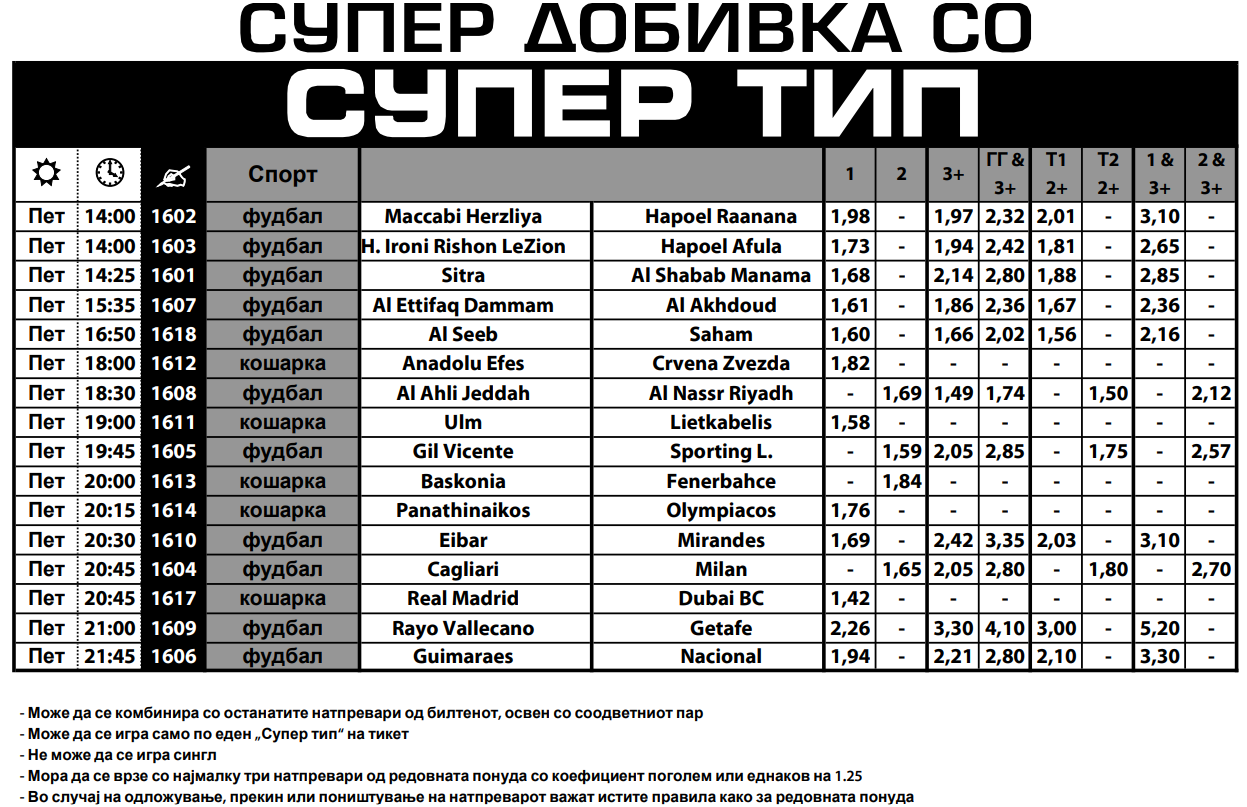 Комбинација од фудбал и кошарка има во денешната понуда на Супер типот каде може да се најдат многу интересни зголемени коефициенти. Возбудувањата ќе започнат уште во 14 часот кога се играат два меча од израелското првенство, а на кое фаворити се домашните екипи.