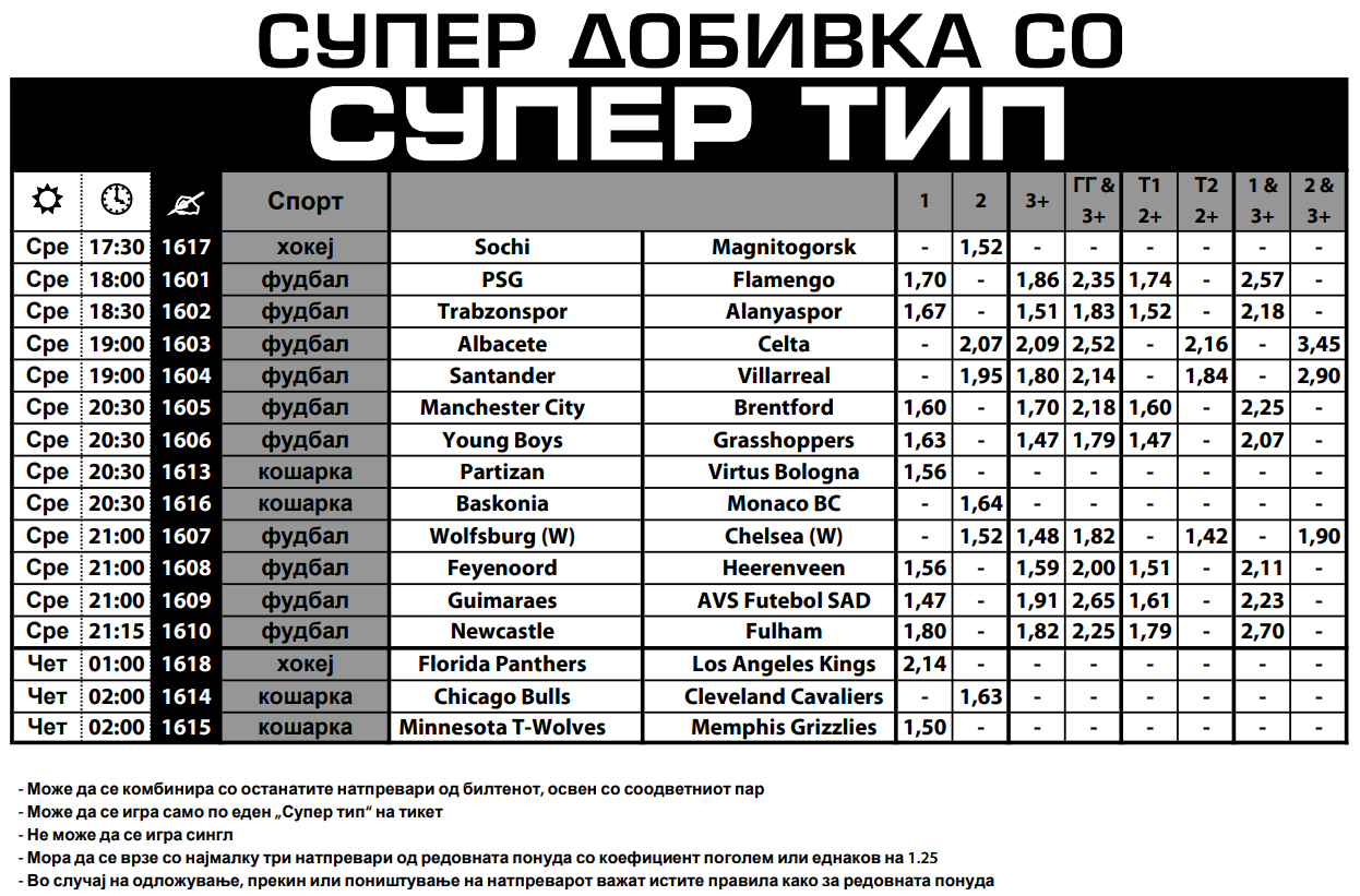 Фудбалот очекувано е најзастапен и има зголемени коефициенти за победи на Пари Сен Жермен, Манчестер сити, Феенорд, Њукасл, Трабзонспор, Јанг бојс, Селта Виго…