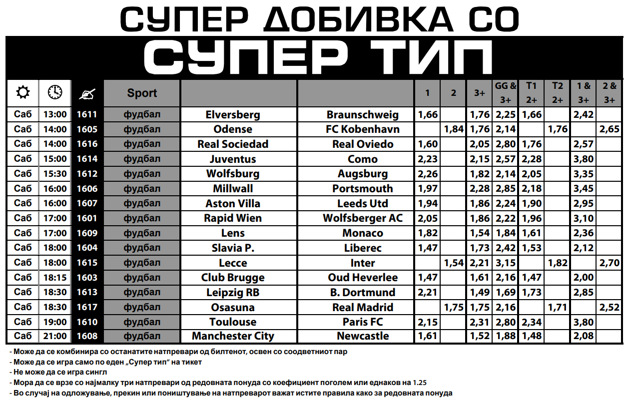 Јувентус на свој терен го пречекува Комо и за победа на Старата дама квотата е дури 2.23. Манчестер сити ја има фаворитската улога против Њукасл, а зголемени коефициенти има и за триумфи на Бриж, Лајпциг, Астон вила, Славија Прага…