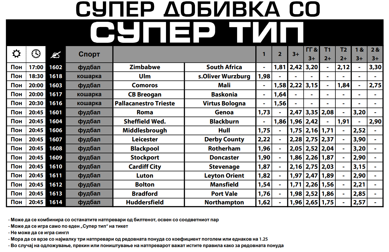 Комбинација од фудбал и кошарка нуди денешната понуда во Супер типот на Sport Life. Возбудувањата започнуваат со дуелот меѓу Зимбабве и Јужна Африка на Африканскиот куп на нациите, каде што за триумф на Јужна Африка се дава зголемена квота од 1.81. Интересно е дека огромна е квотата 3.20 за да биде ГГ3+. Од АКН, Мали да слави над Комори е со квота од 1.58.