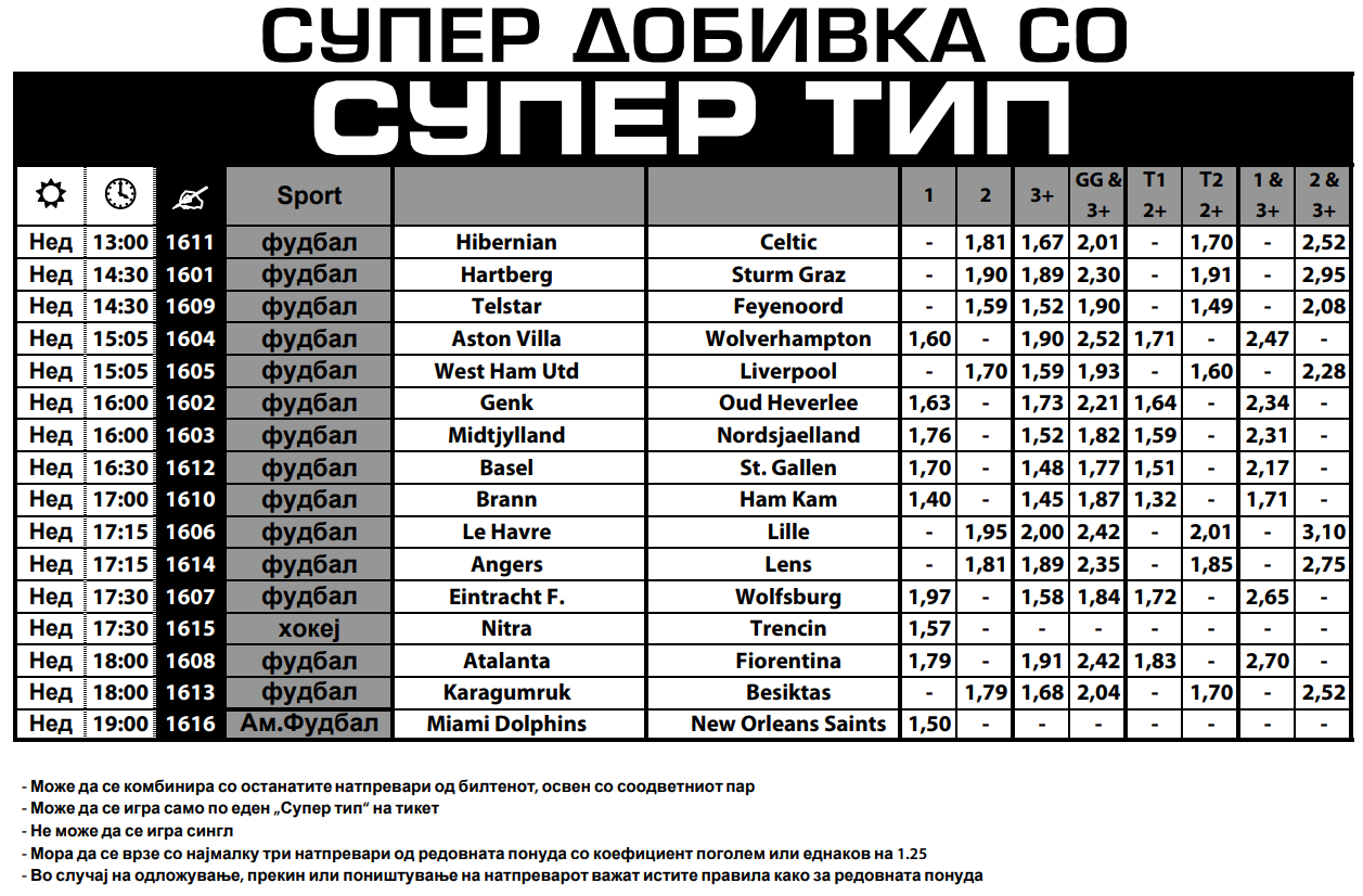 Во единствениот хокеј кој е во понудата фаворитската улога ја има тимот на Нитра кој дома игра против Тренчин и за „кец“ квотата е 1.57. Од НФЛ програмата, Мајами делфинс на свој терен да го победат Но Орлеанс е со коефициент од 1.50.