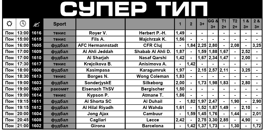 Во супер типот за денеска се нудат 16 фудбалски, тениски и ракометни натпревари со зголемени квоти кои може да се искористат за подобрување на потенцијалната добивка на тикетите уплатени во Sport Life.