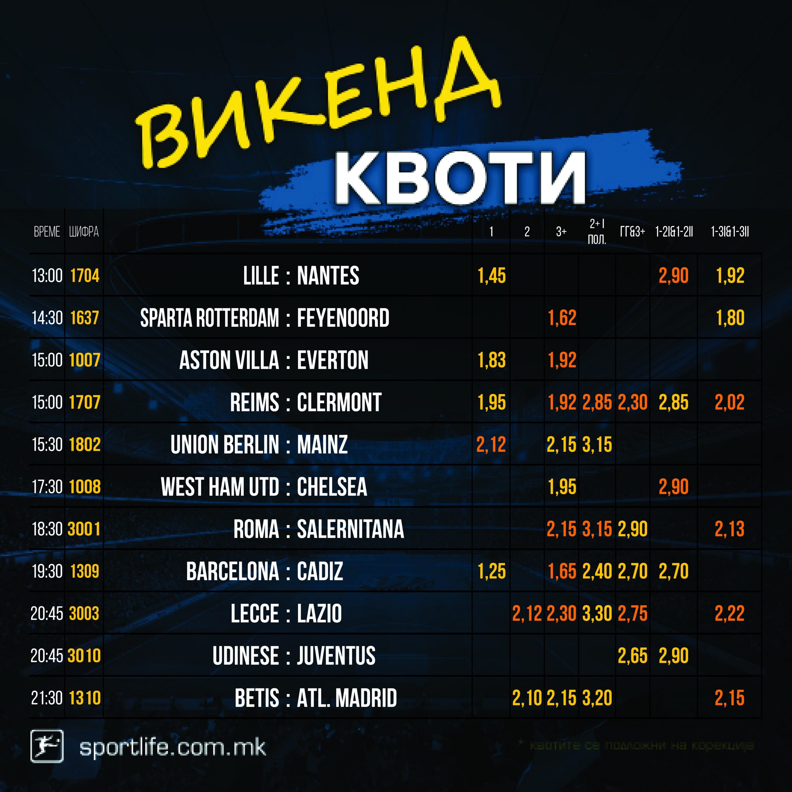 Со започнувањето на најсилните лиги во Европа, започна и стандардната понуда на Викенд квоти во Sport Life. За денес подготвени се 11 интересни средби на кои има коефициенти кои вредат да се искористат.