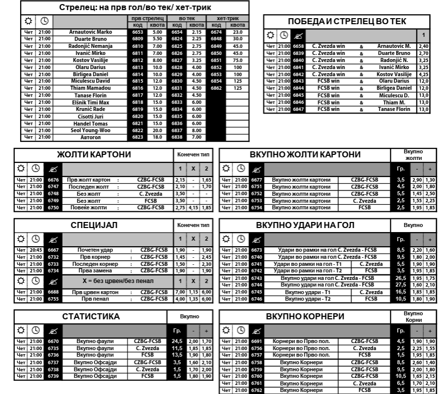 За дуелот во Белград, каде што гостува некогашната Стеауа, денешен ФЦСБ, фаворит е српскиот првак, па и најголема е веројатноста гол да постигнат напаѓачите на Црвено-белите, како Арнаутовиќ, Дуарте, Радоњиќ, Иваниќ…
